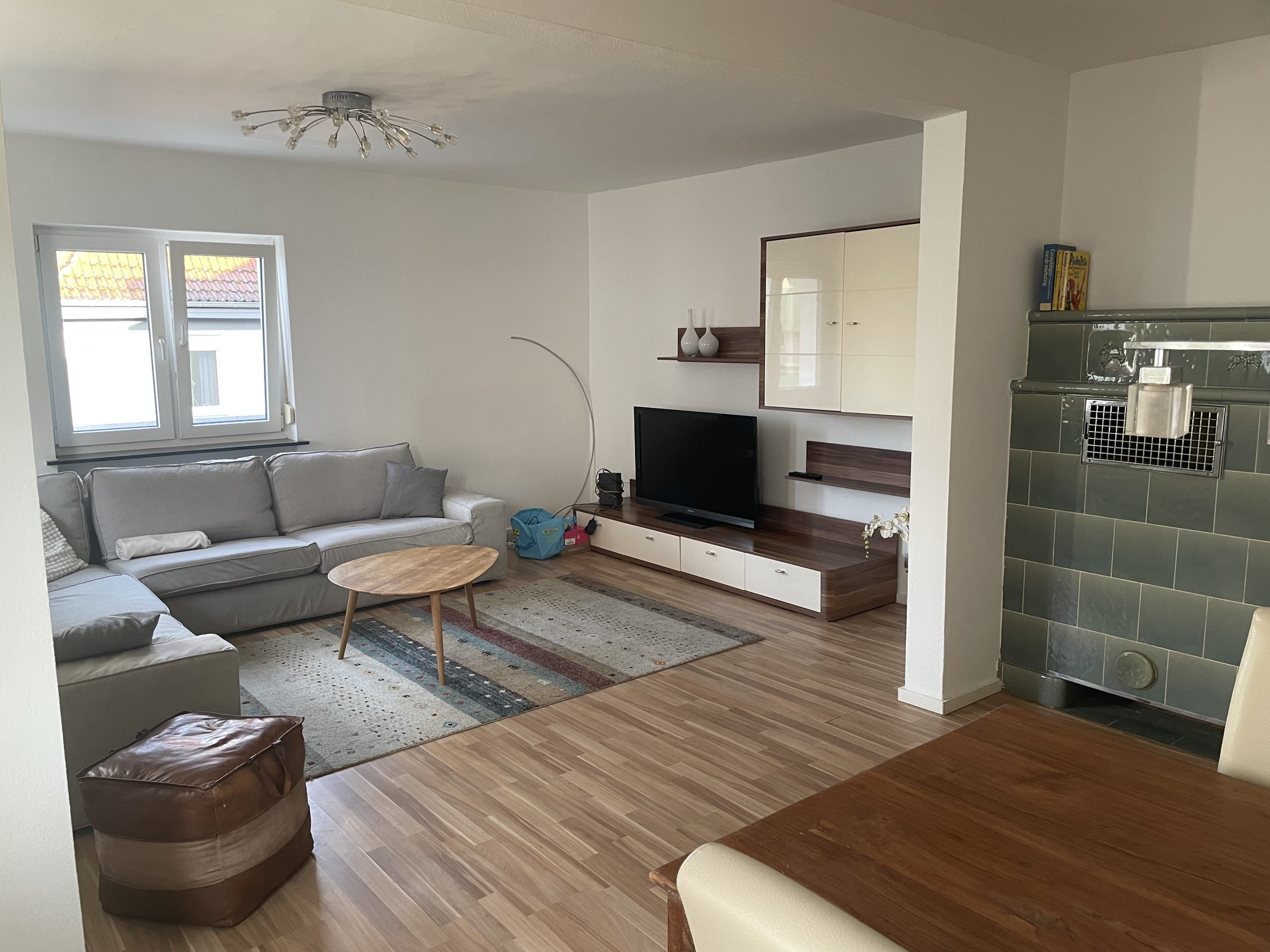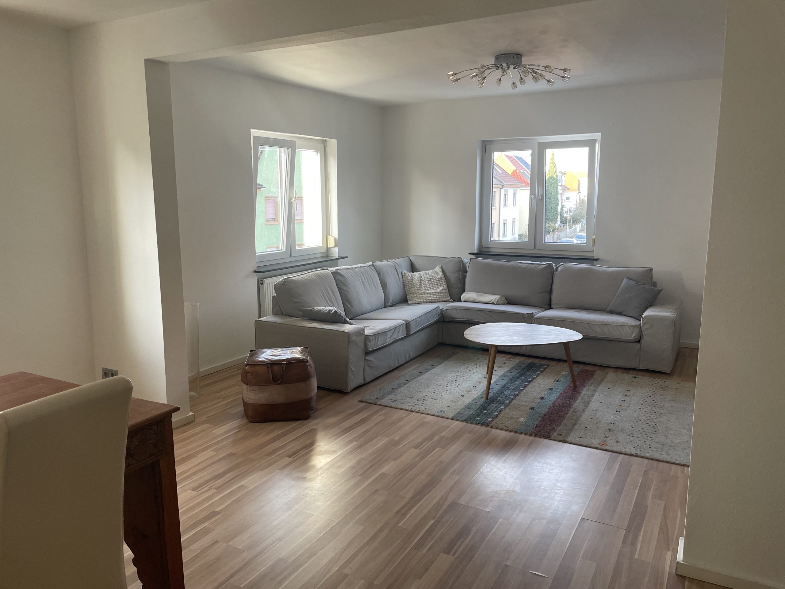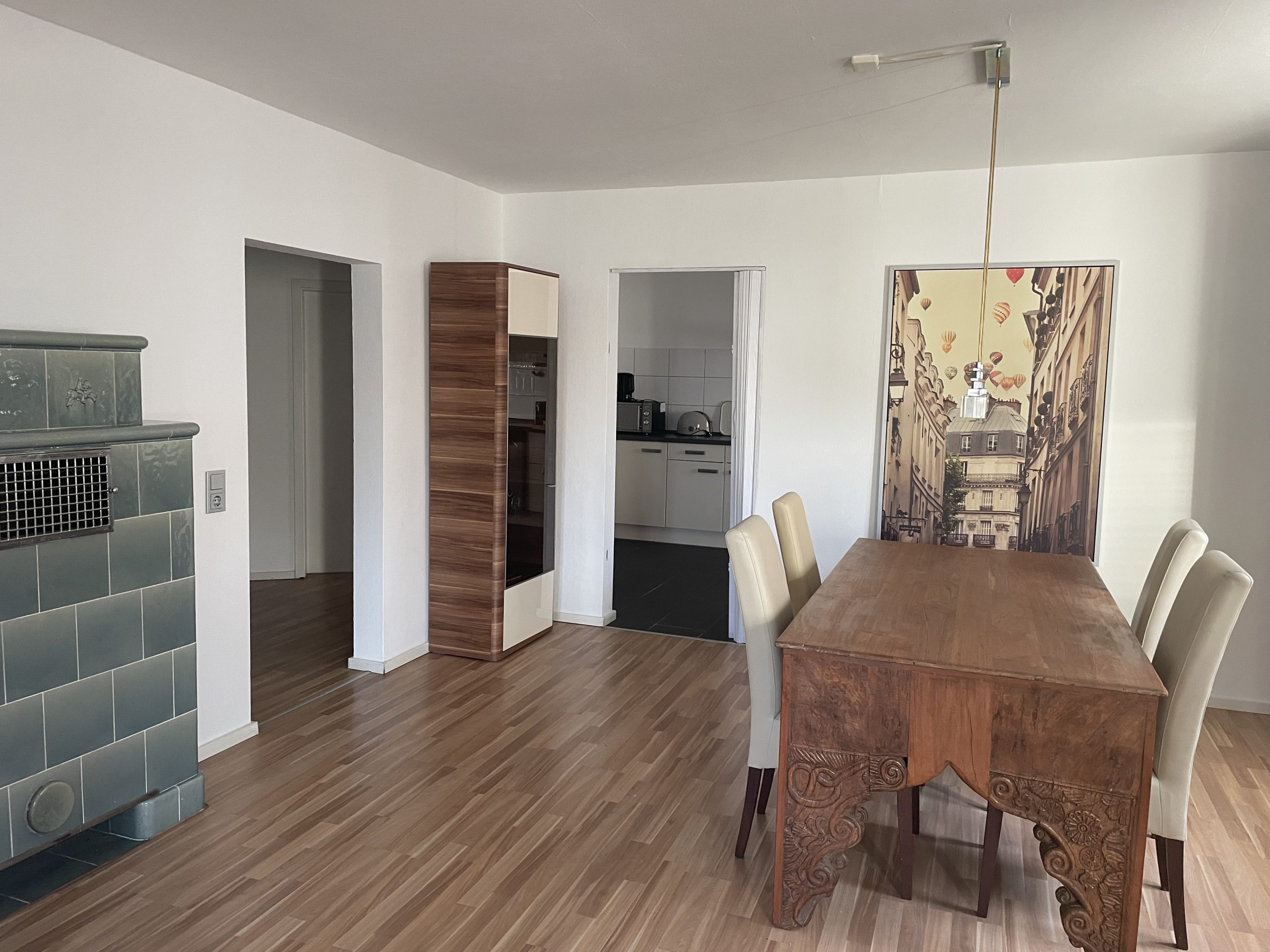 Sie finden hier eine sanierte und hochwertig ausgestattete 3 - Zimmer - Wohnung. Die Altbauwohnung befindet sich im 1. Obergeschoss. Das Wohnzimmer ist mit einer Couch, einem Schreibtisch und einem TV Board mit Fernseh sowie weiteren schönen Details ausgestattet. Die offene Küche bietet eine neue Einbauküche mit allen Elektrogeräten sowie einer Spülmaschine und einem Induktionskochfeld. Daran grenzt ein sehr moderner und heller Essplatz an. Ein bequemes und hochwertiges Doppelbett (1.80m) und ein Kleiderschrank befinden sich im Schlafzimmer. Das 2. Schlafzimmer ist ebenfalls mit einem Bett (1.40m) und einem Schrank ausgestattet. Das sanierte Badezimmer ist modern in grau mit Dusche.