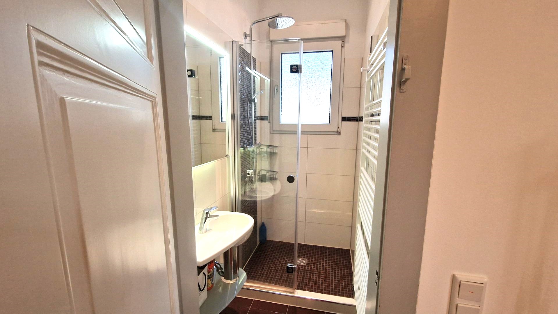 Die Wohnung liegt im EG eines sanierten Altbaus. Sie ist unterteilt in Flur, Büro, großes Schlafzimmer, Büro mit Ausziehcouch, ein großes Wohnzimmer, Wohnküche mit moderner Einbauküche, ein Bad mit Dusche, eine Gästetoilette. Die Wohnung wurdevor ca. 10 Jahren komplett renoviert und neu möbliert und verfügt über Holzdielen und Fliessenboden
