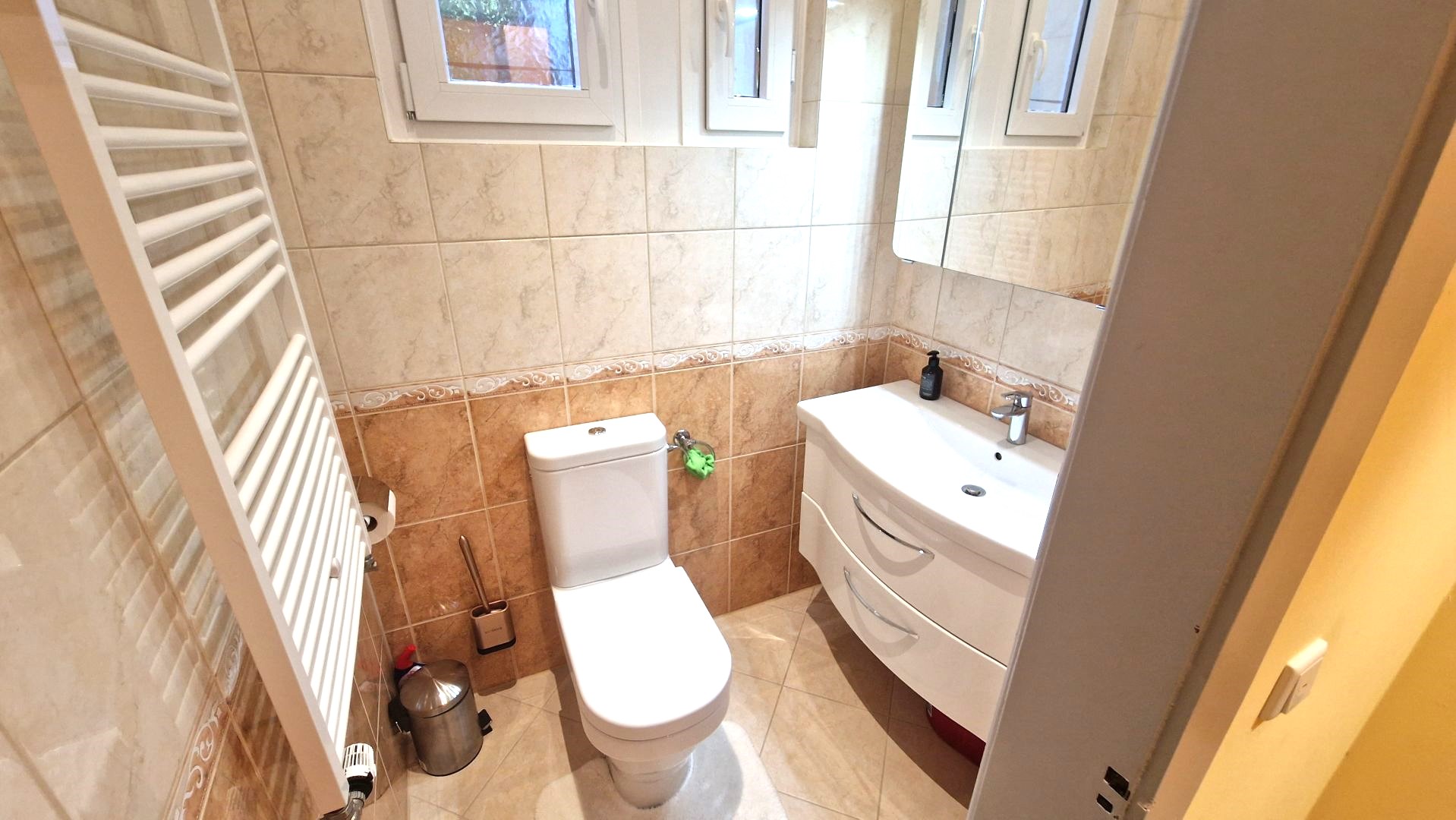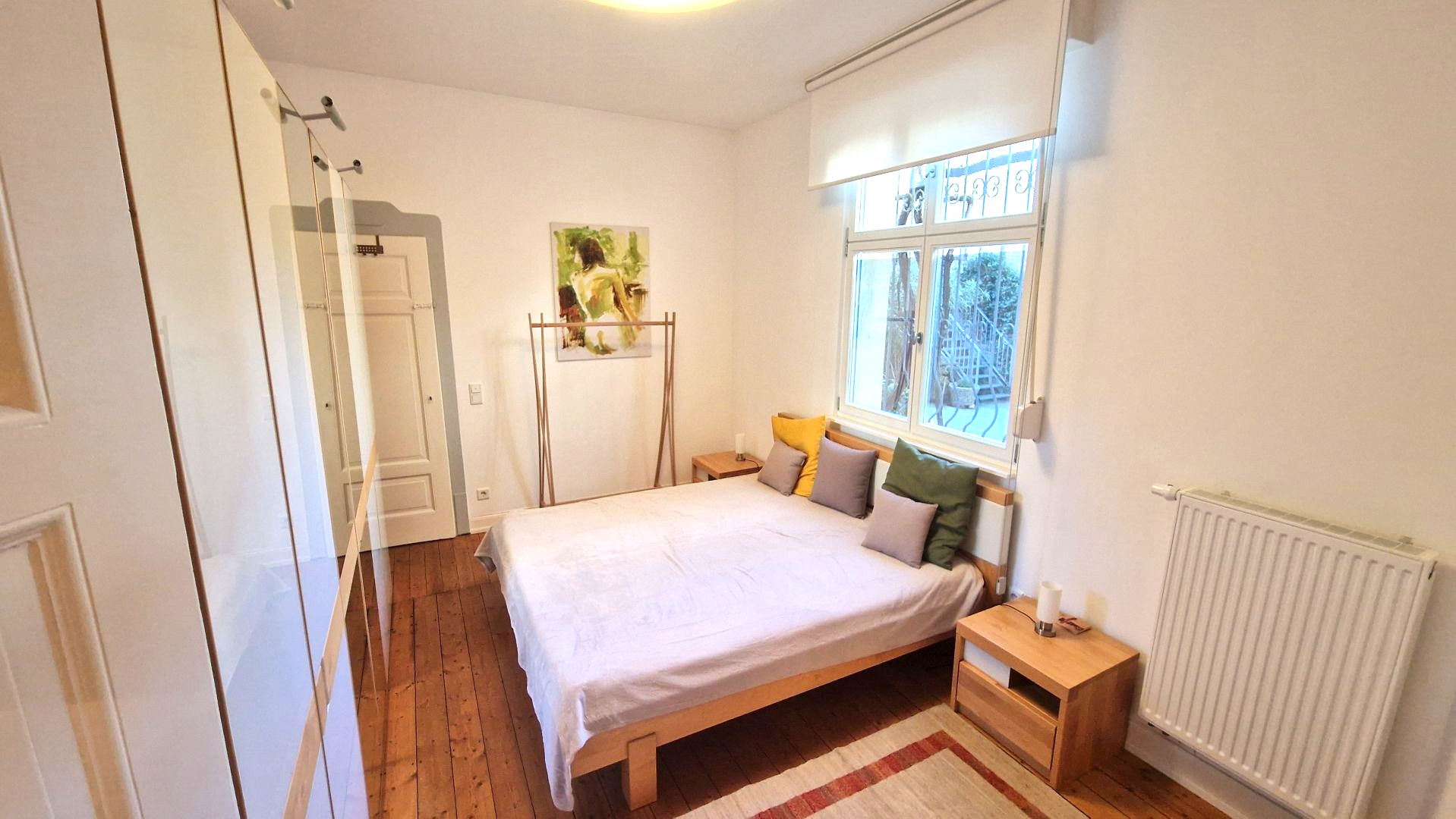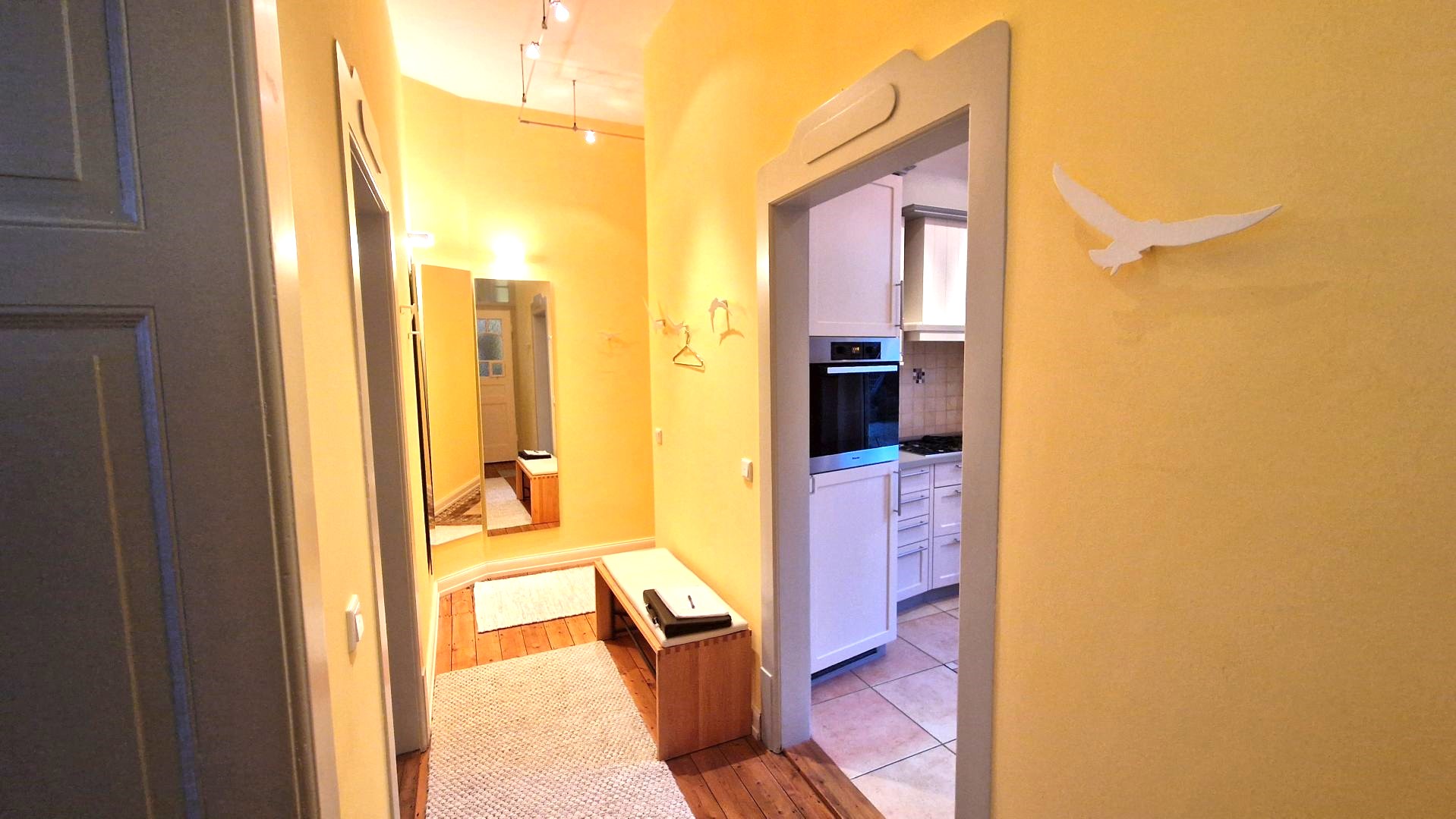 The apartment is located on the ground floor of a renovated old building. It is divided into hall, officeroom, large bedroom, Officeroom with pull-out couch, a large living room, kitchen with modern fitted kitchen, a bathroom with shower, a guest toilet. The apartment was completely renovated 10 years ago and newly furnished and has wooden floorboards and floor tiles.