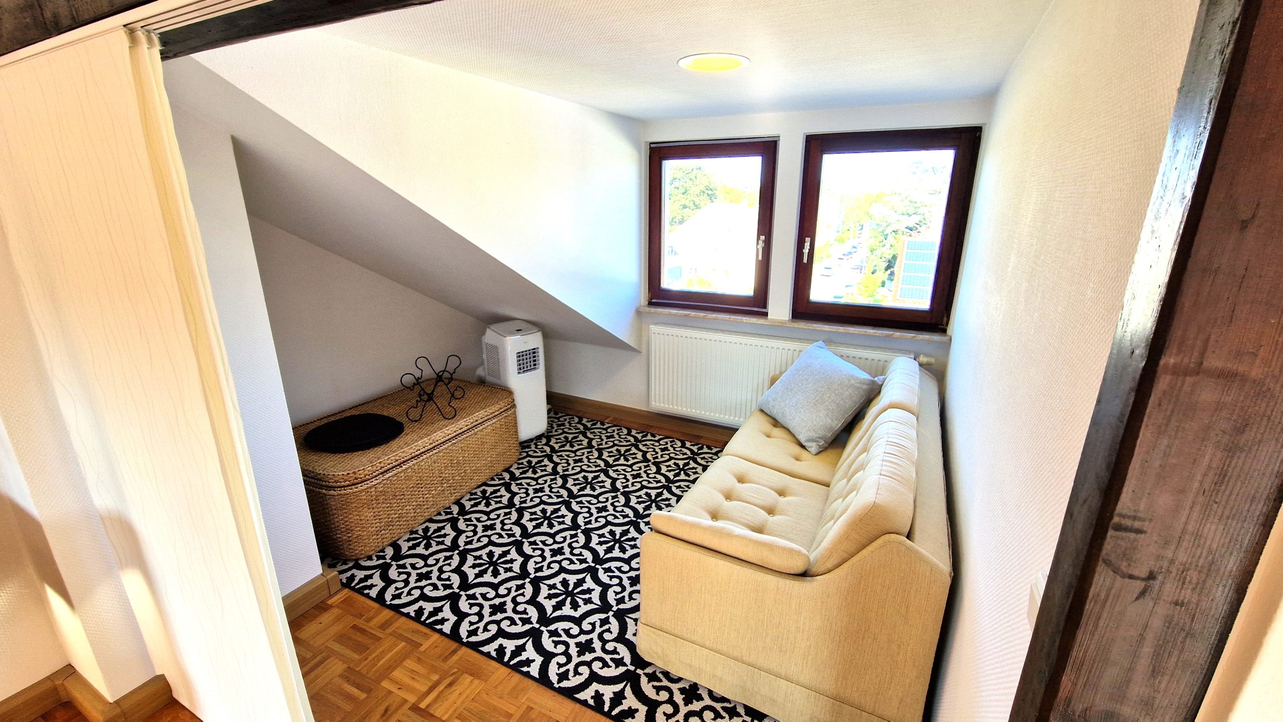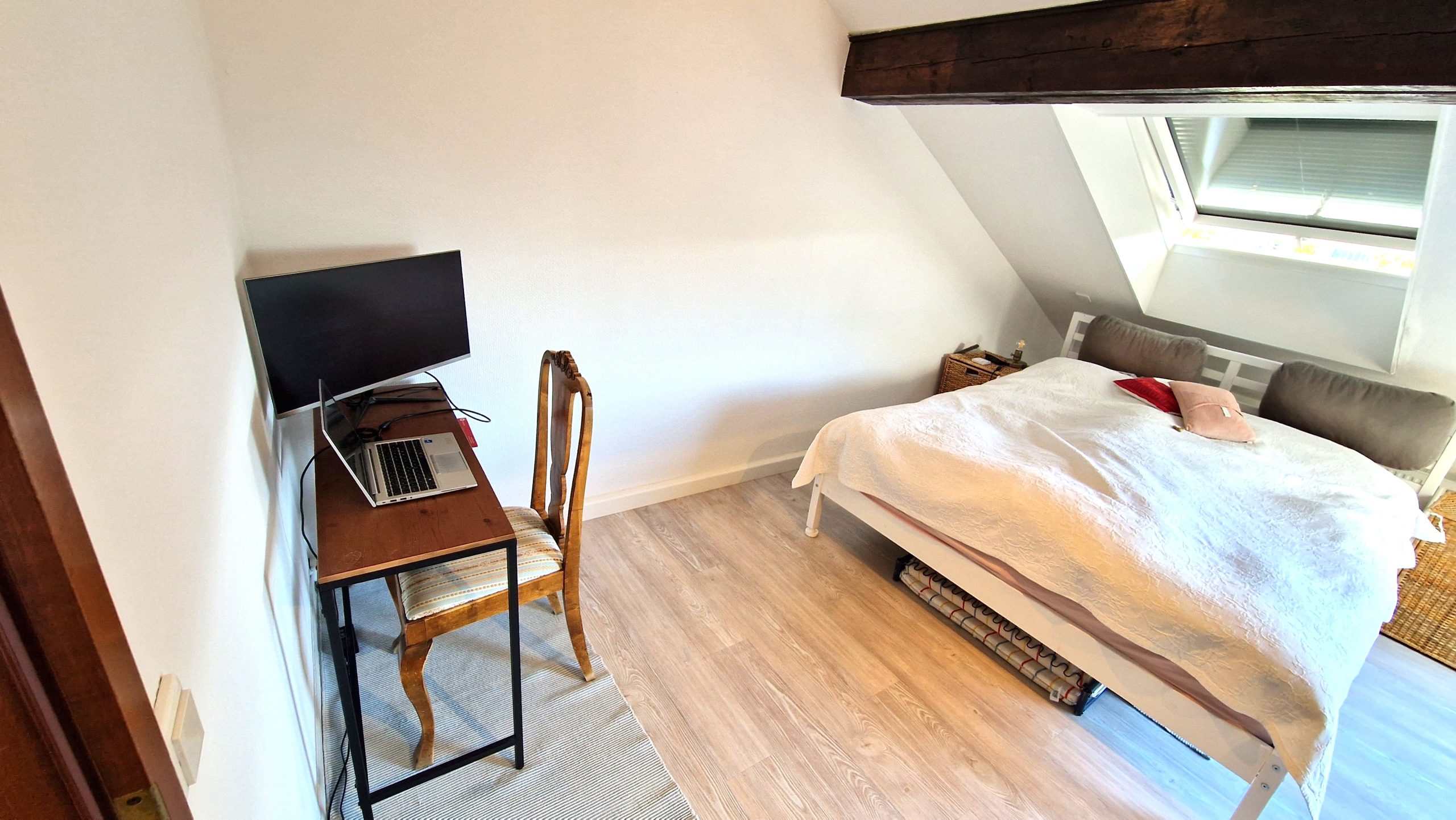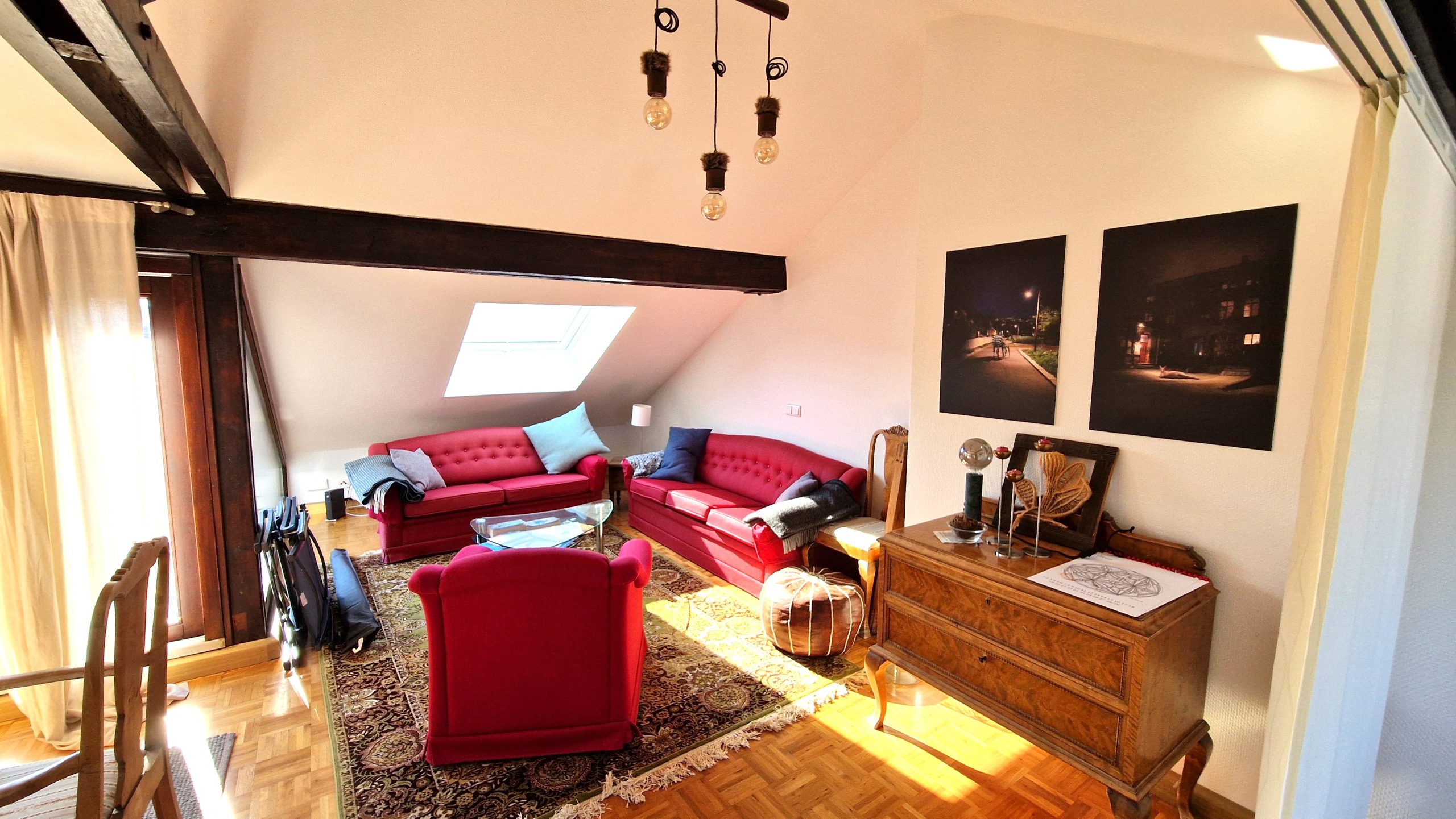 This charming two-room flat is located in the attic of an apartment building in Mannheim-Neckarau. All rooms are accessible via the hallway. There is a bright living/dining room with a reading corner and access to the beautiful roof terrace, a small kitchen equipped with all the necessary amenities, a bedroom with a double bed and desk, and a modern shower room.
